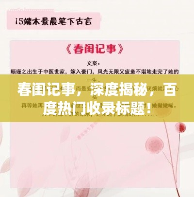 随着互联网的普及,搜索引擎已经成为我们获取信息的重要途径之一,在搜索引擎中,百度无疑是最受欢迎和广泛使用的搜索引擎之一,当我们搜索“春闺记事”时,百度会为我们带来怎样的结果呢?