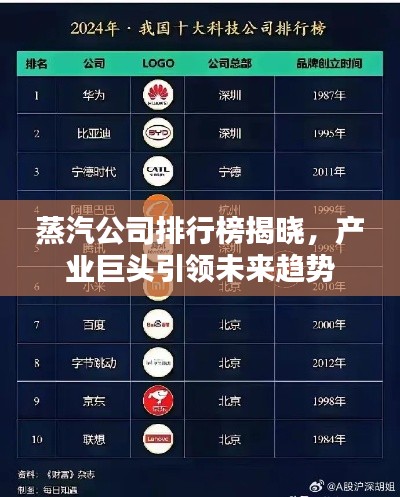 随着科技的飞速发展和工业领域的不断进步,蒸汽行业在全球范围内持续繁荣,本文将根据最新的数据和信息,对全球蒸汽公司进行综合排名,并探讨其背后的产业趋势和未来发展方向。