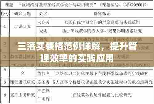 在现代企业管理中,"三落实"是一种重要的工作原则,包括任务落实、责任落实和执行落实,为了有效推进三落实工作,许多企业开始采用表格化管理,通过制定详细的表格范例来指导员工完成各项工作任务,本文将介绍三落实表格范例及其应用,以帮助企业更好地推进三落实工作。