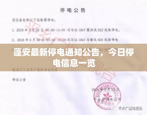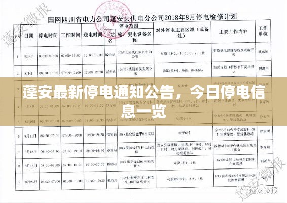 为蓬安今日停电通知的最新信息,请您务必密切关注停电通知,做好相关准备,确保日常生活和工作不受影响,再次感谢您的理解与配合!电力部门将竭诚为您服务!