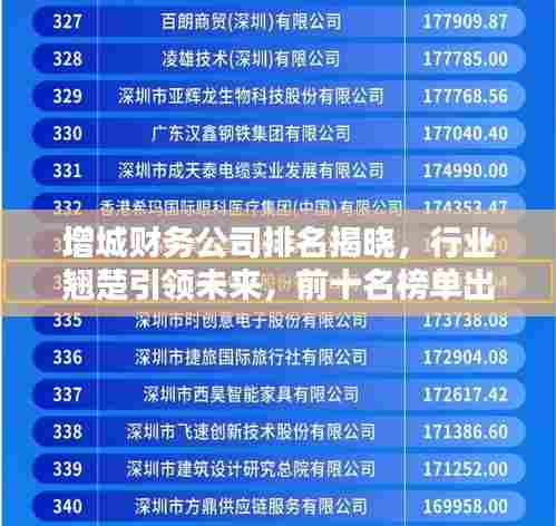 转载请注明来自瑞丽市段聪兰食品店,本文标题:《增城财务公司排名揭晓,行业翘楚引领未来,前十名榜单出炉!》